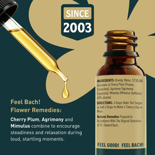 Infusion of Feel Bach! flowers: Cherry Plum (Prunus Cerasifera), Agrimony (Agrimonia Eupatoria) and Mimulus (Mimulus Guttatus)
